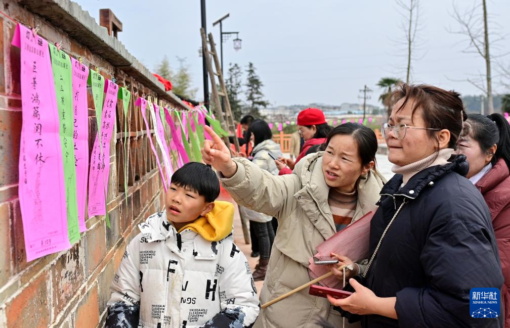 1月31日,在中国历史文化名村、江西省抚州市金溪县双塘镇竹桥村,游客饶有兴致地参加景区举办的迎新春猜谜趣味比赛。