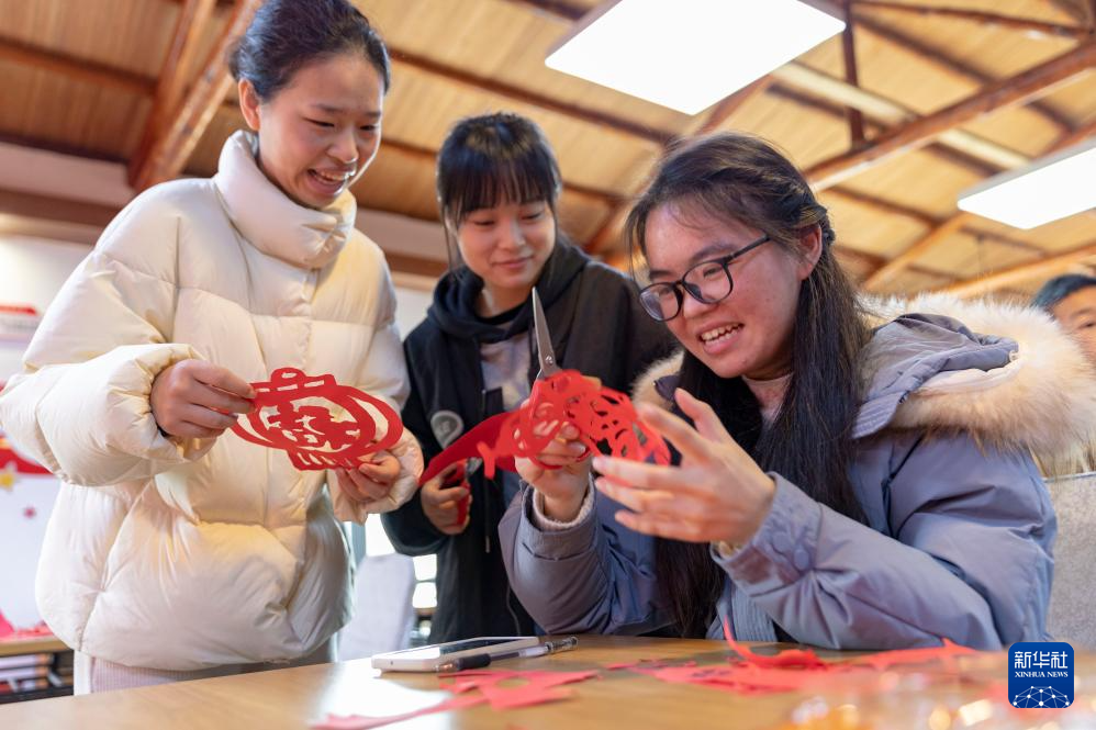1月31日,在江西省庐山市华林镇党群服务中心内,人们一起剪窗花。