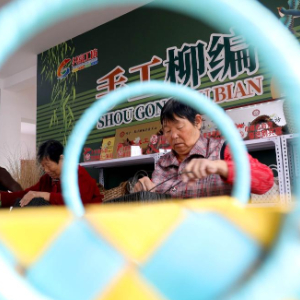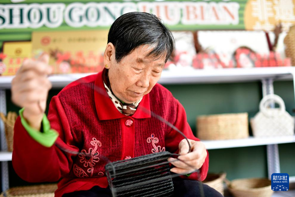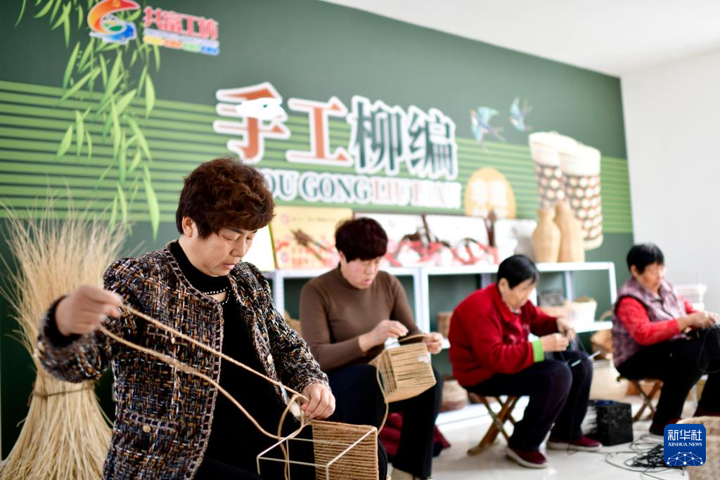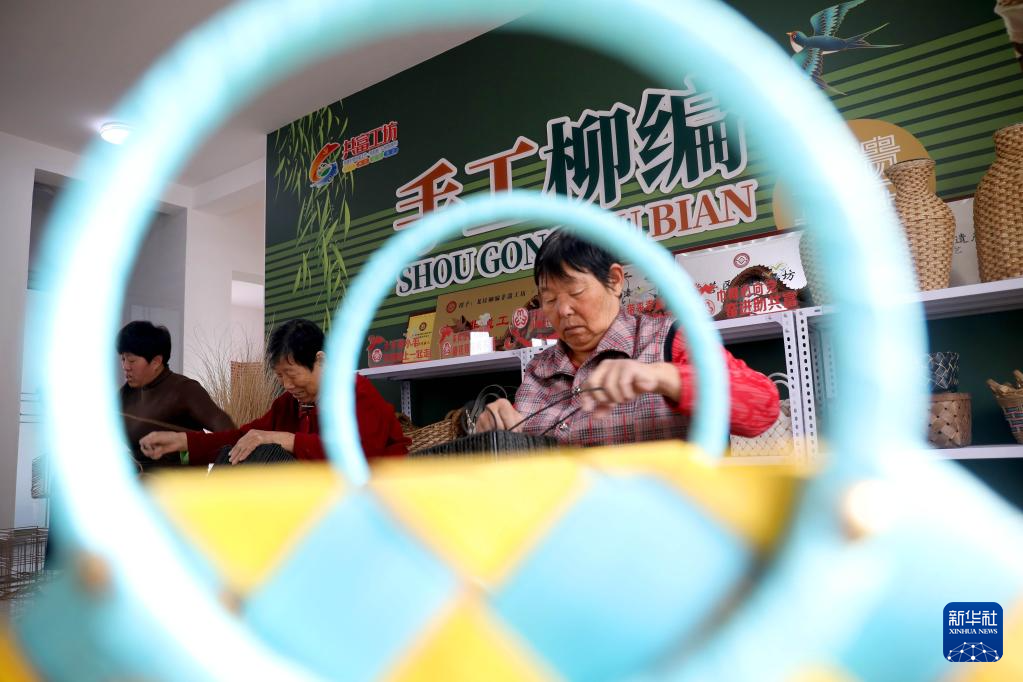 2月2日,在东营市东营区龙居镇“共富工坊”,村民加工柳编产品。