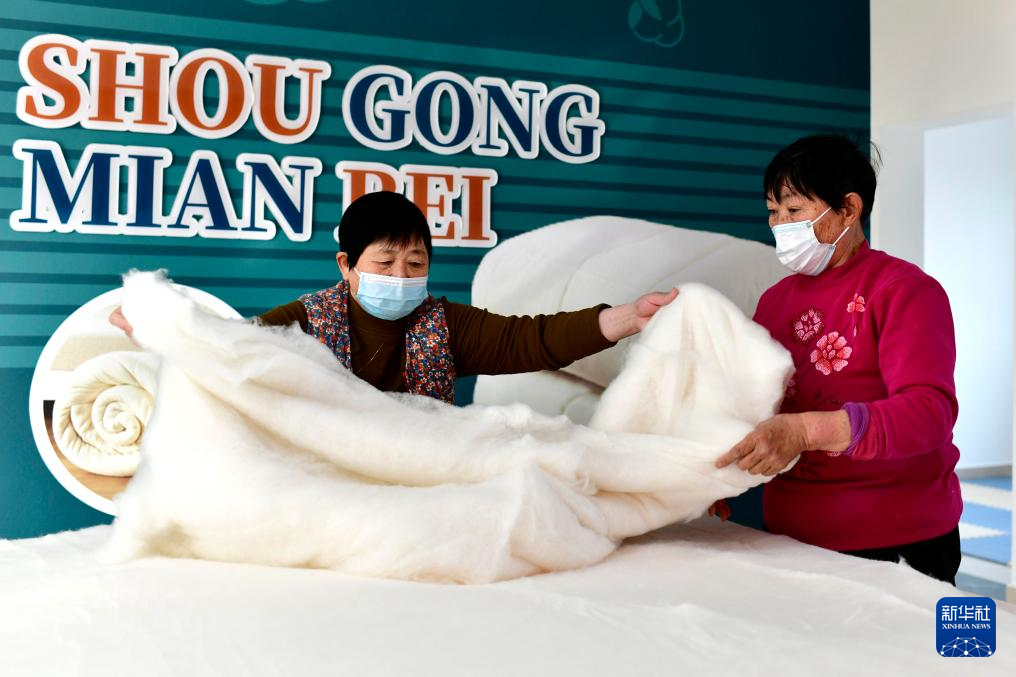 2月2日,在东营市东营区龙居镇“共富工坊”,村民加工手工棉被。