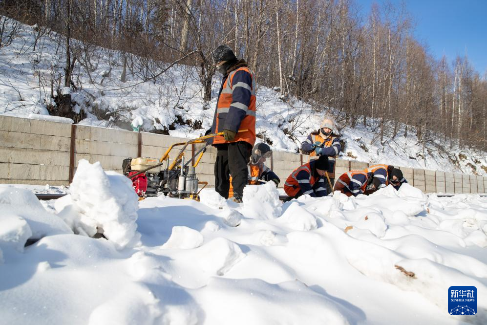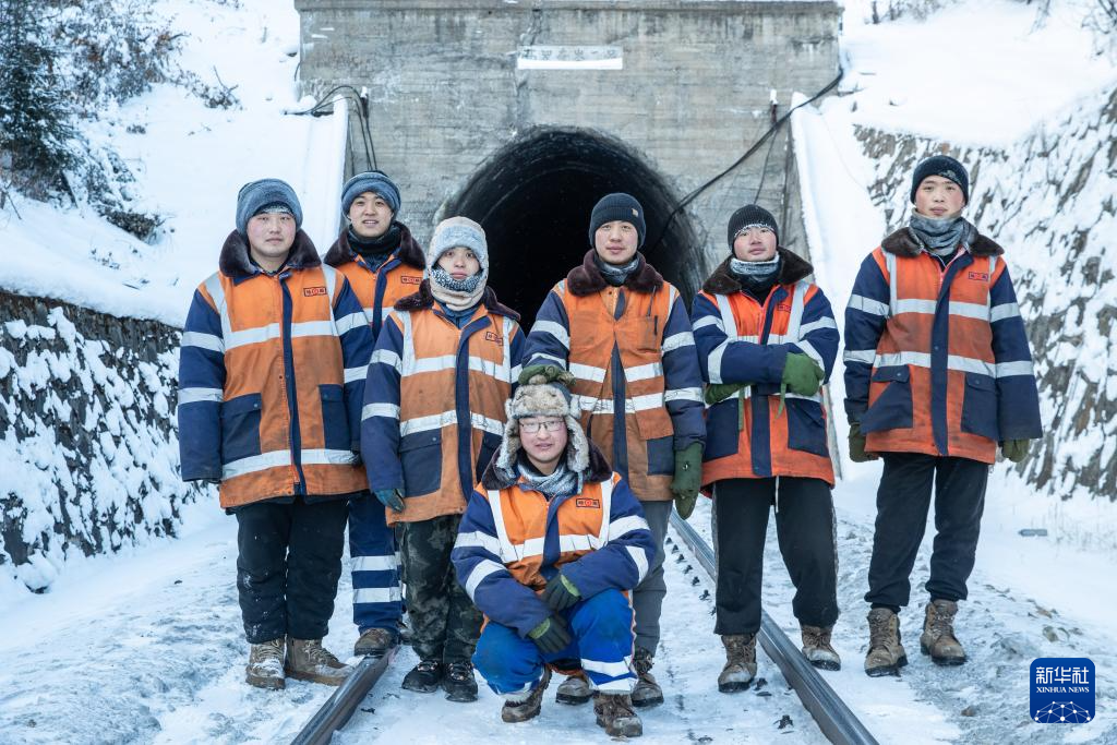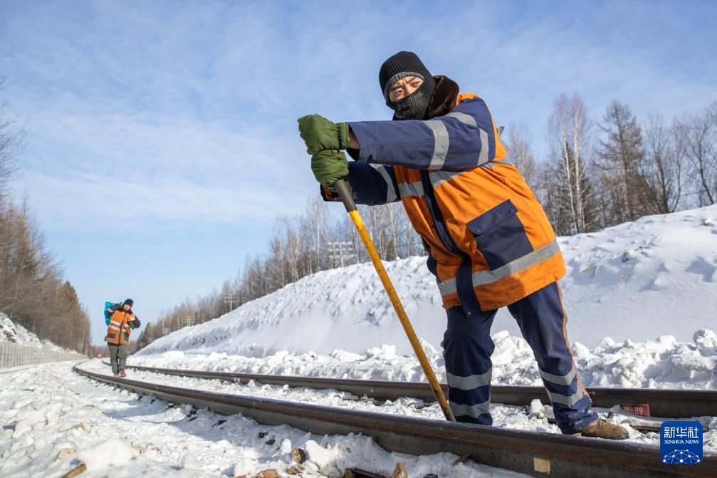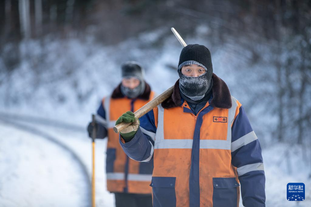 1月31日,在加格达奇工务段盘古线路车间508公里作业区,盘古线路车间的工人周颖波和工友一起避让火车。