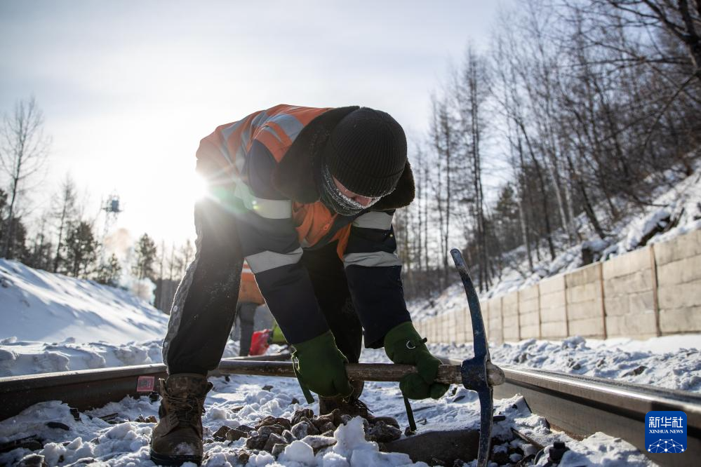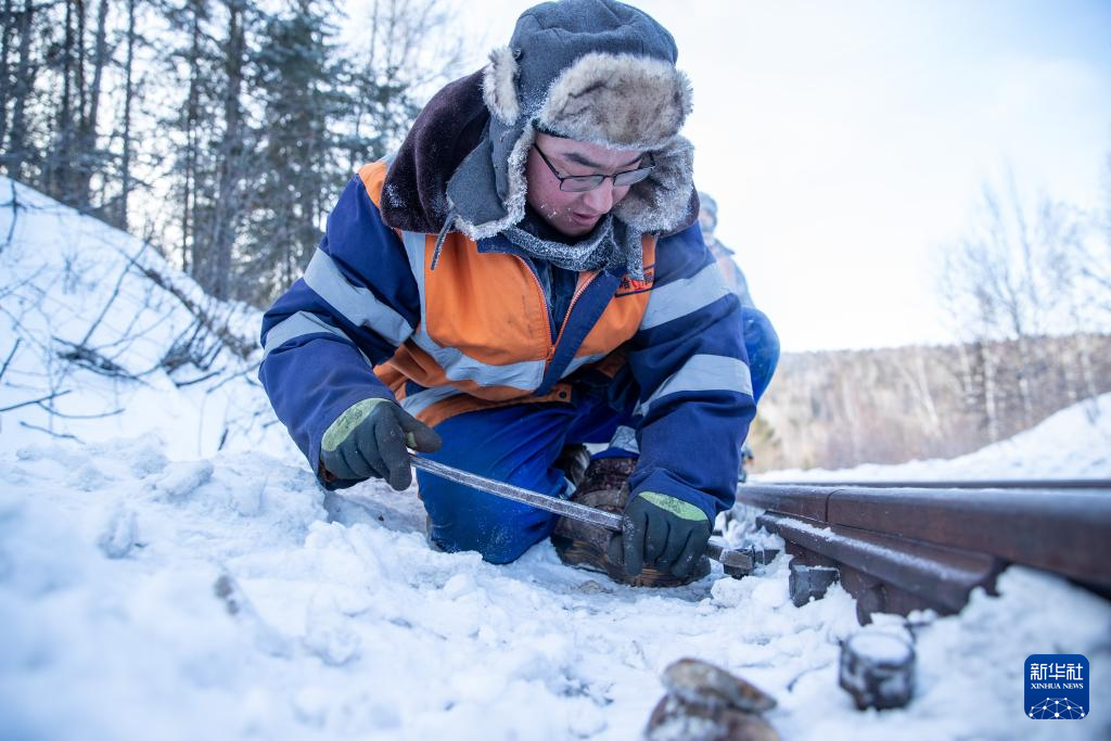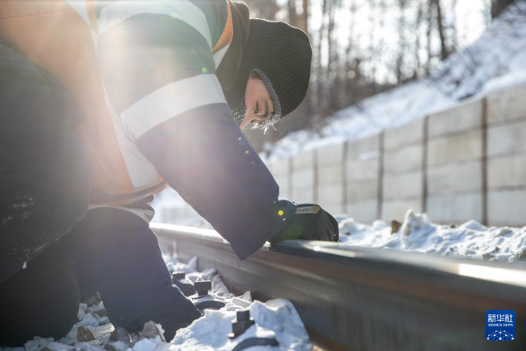 1月31日,在加格达奇工务段盘古线路车间508公里作业区,盘古线路车间的工人霍文超在拧紧螺栓。
