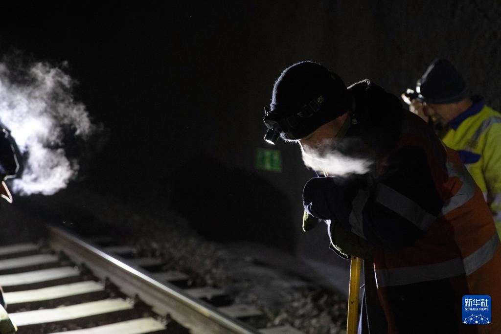 2月1日,在西罗奇岭二号隧道内,盘古线路车间的工人霍文超和工友进行作业。
