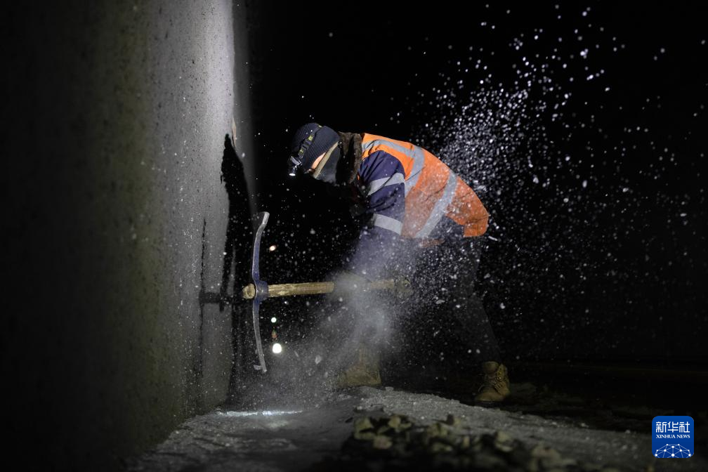 2月1日,在西罗奇岭二号隧道内,盘古线路车间的工人刘泊序在进行破冰作业。