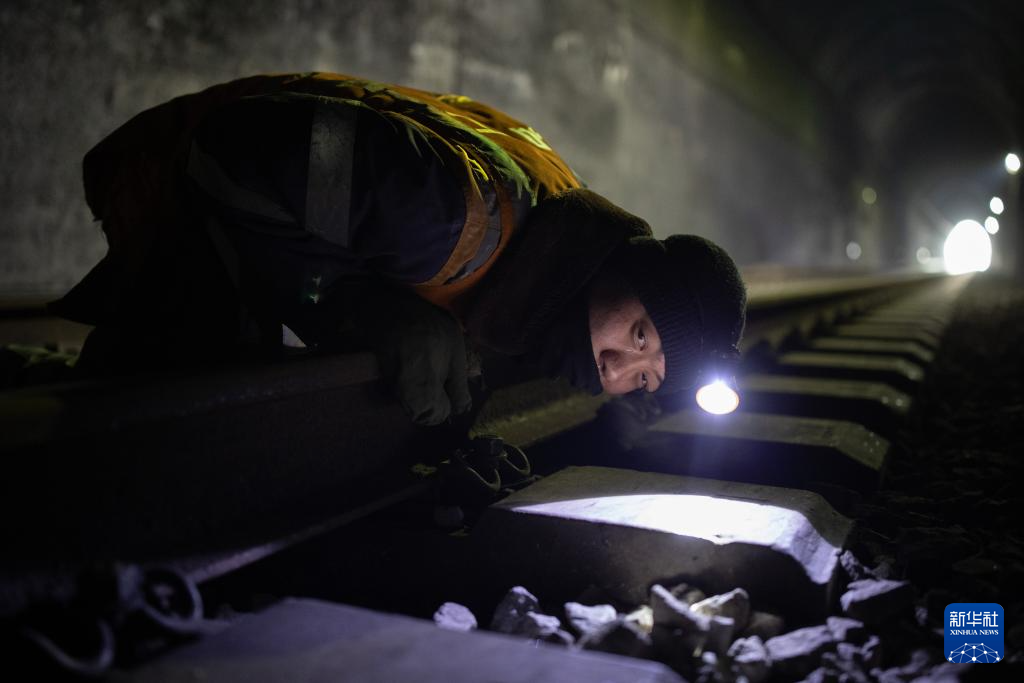 2月1日,在西罗奇岭二号隧道内,盘古线路车间的工人丁一博趴在铁道线上观察线路高低。