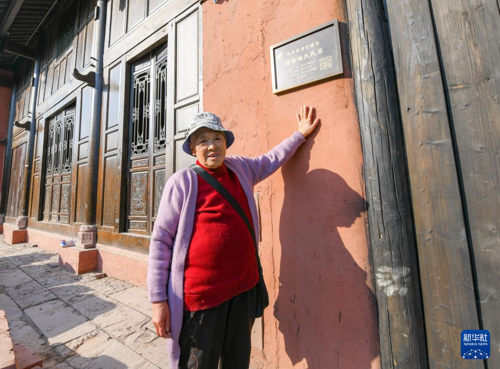 1月30日,78岁的姚永清老人在建昌古城自家老宅的铭牌前留影。姚永清老人一家五代都居住在建昌古城的老宅中,古城保护更新项目启动后,她经常回来看看老宅的修缮改造情况。