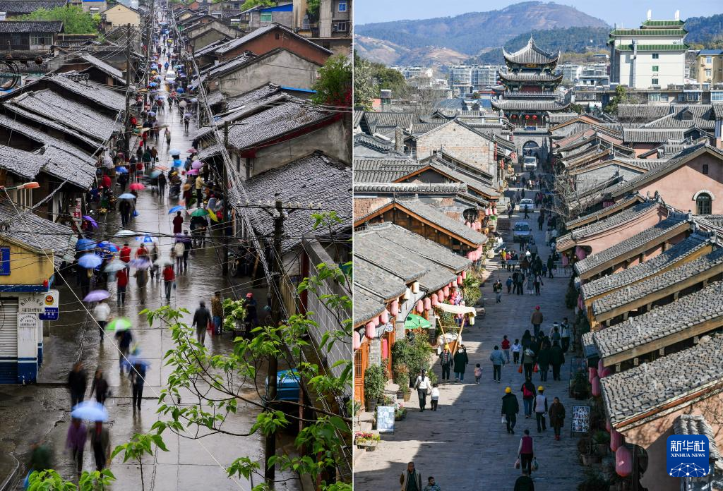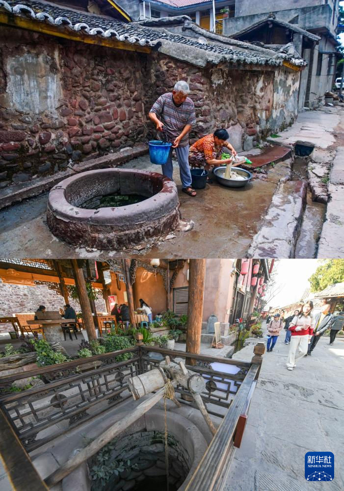 这是一张拼版照片。上图为古城居民使用豆芽井取水(2017年4月25日,新华社发胡小平摄);下图为如今已成为旅游景点的豆芽井,周围民居也已修缮改造为餐馆(2024年1月31日,新华社记者王曦摄)。