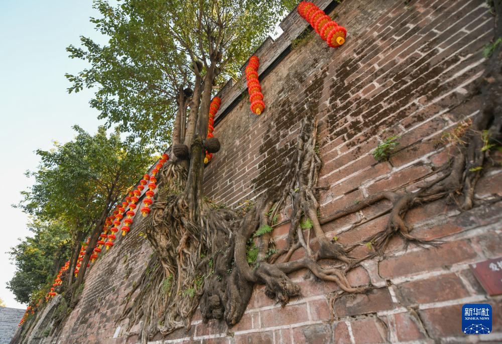 这是1月30日拍摄的建昌古城大通门城墙上的黄葛树。这些古树在古城修缮改造过程中得到保护。