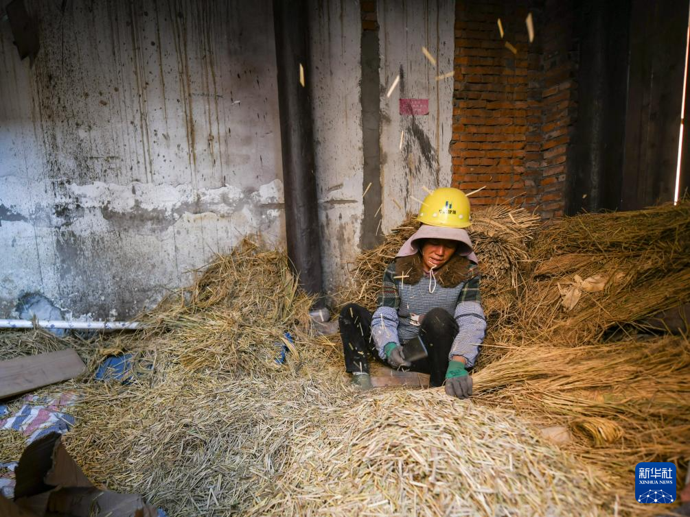 1月30日,工人加工草筋用于墙面草筋泥制作。