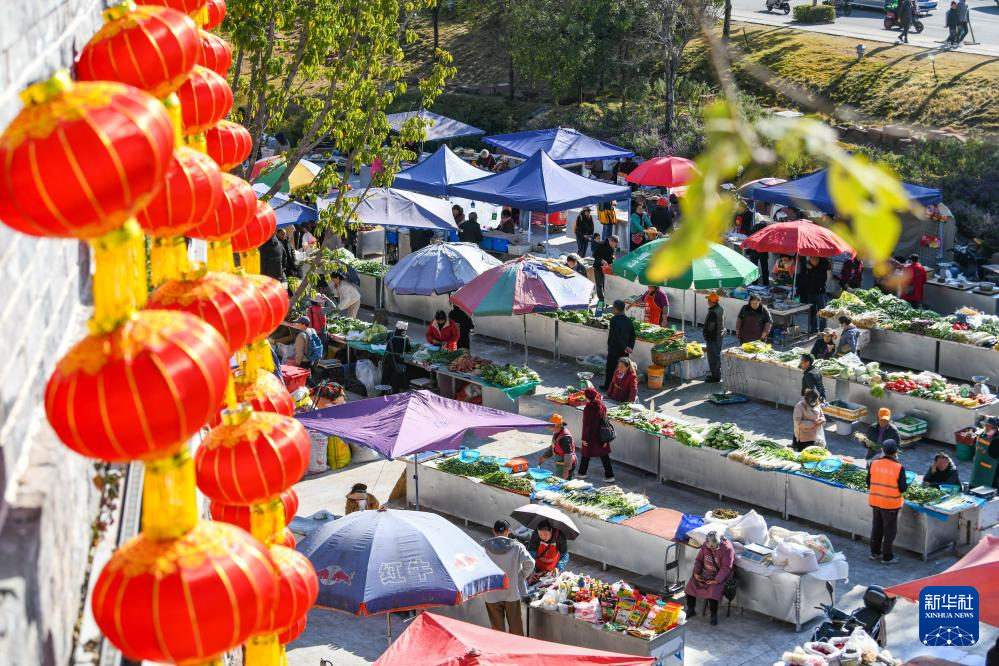 这是1月31日拍摄的建昌古城大通门城墙下的临时农贸市场。因古城修缮改造,临时将城内原有的农贸市场设在此处。