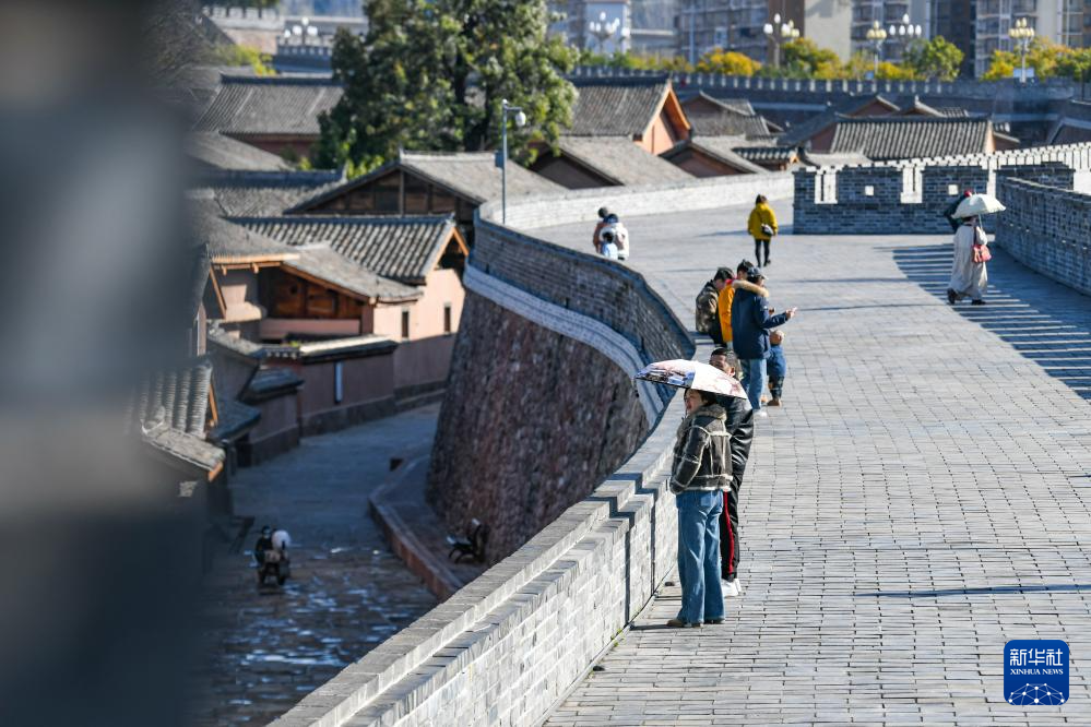 1月31日,游客在建昌古城城墙上观光。