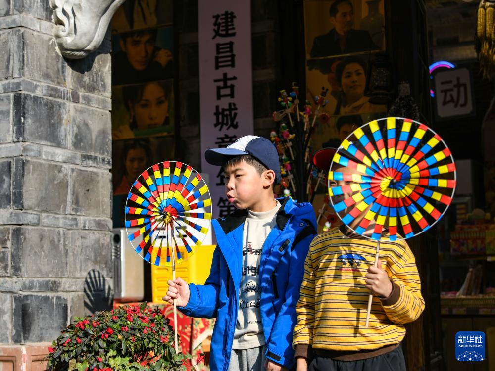 1月30日,小游客在建昌古城内玩风车。