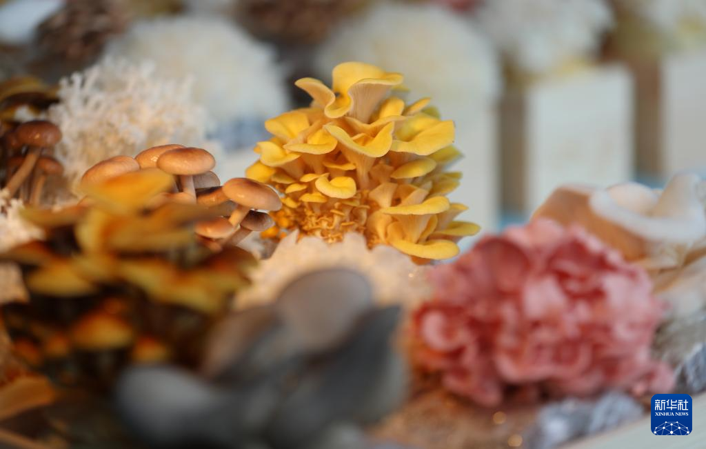 2月1日,在盘锦嘉润禾食用菌种植专业合作社,农民在大棚里采摘由芦苇作为菌棒原料培养的蘑菇。