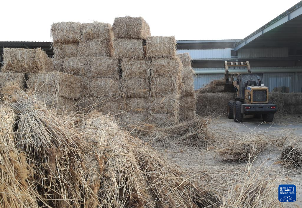 2月1日,在盘锦积葭生态板业有限公司,工作人员操控铲车运输芦苇。