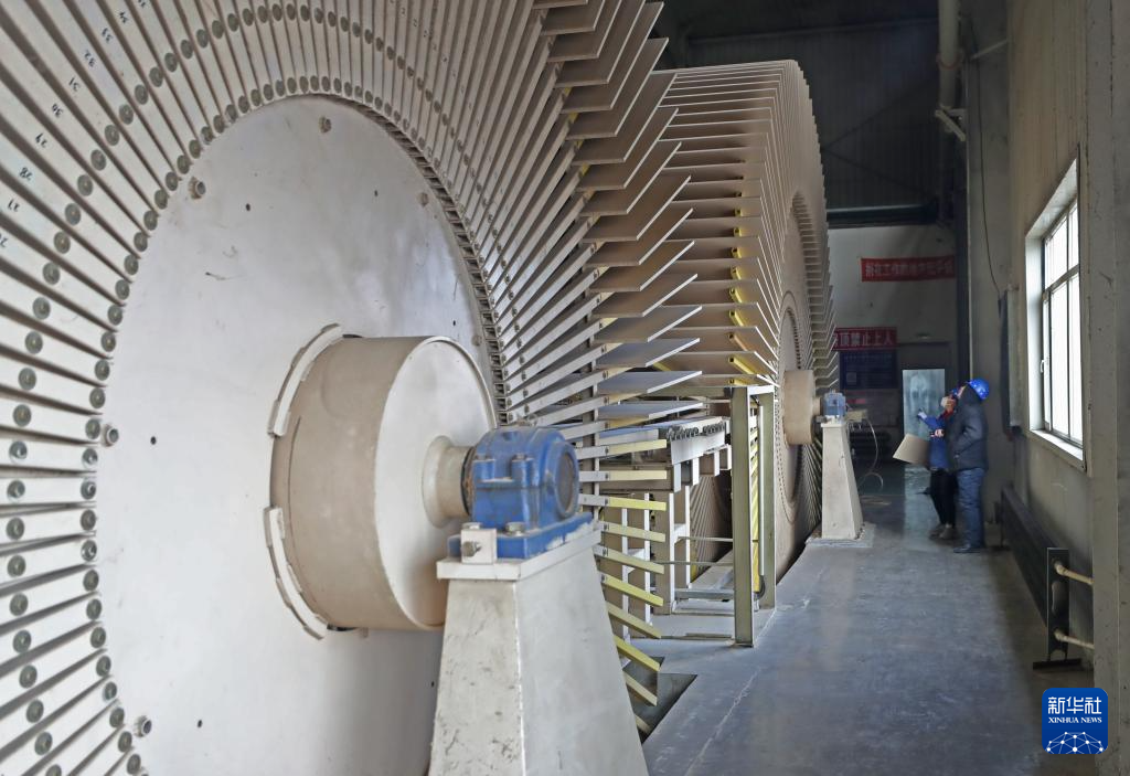 2月1日,在盘锦积葭生态板业有限公司,工作人员查看芦苇制作的板材。