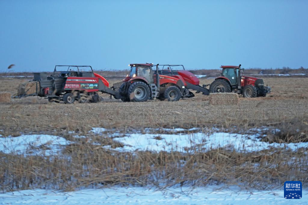 1月31日,在盘锦辽河口湿地,农民将收割好的芦苇装车。