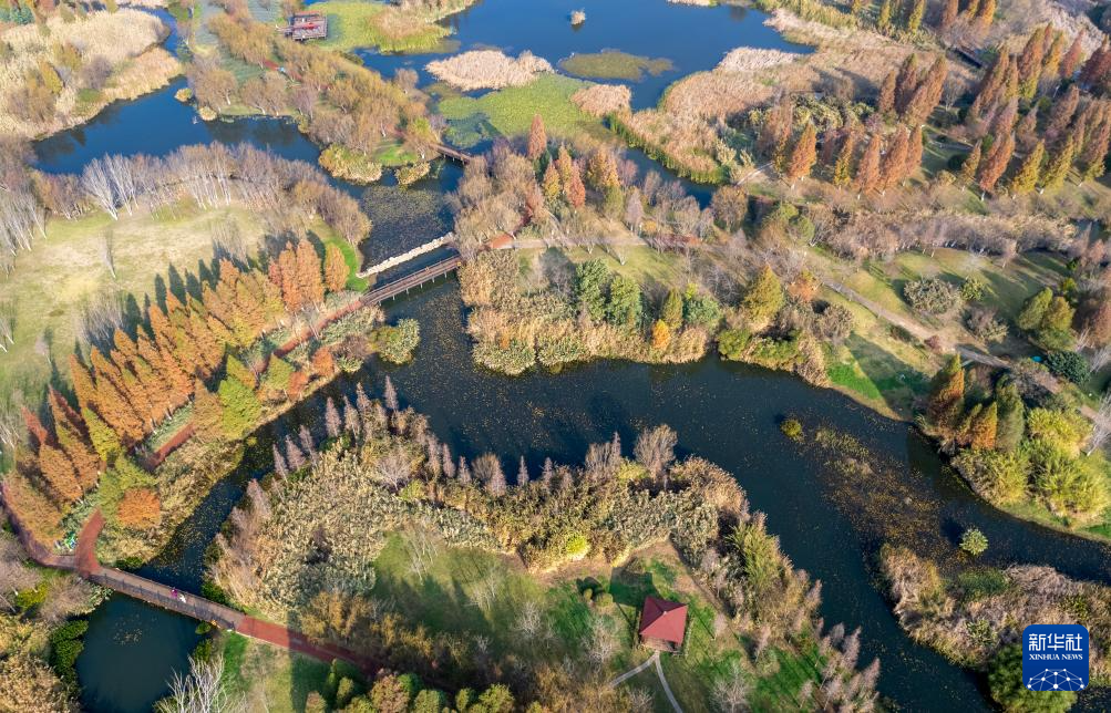 这是2月2日拍摄的星海半岛湖滨生态湿地公园内的水杉林(无人机照片)。