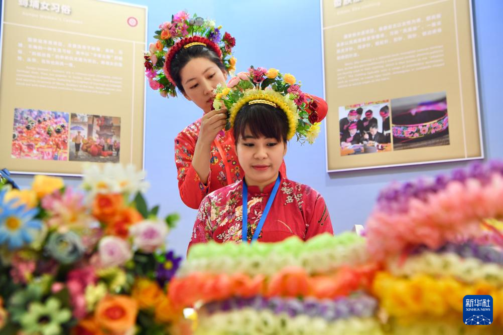 2月2日,两名女孩在2024中国—东盟人文交流年展览活动上展示福建蟳埔女头饰。