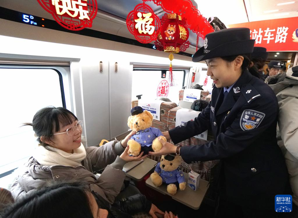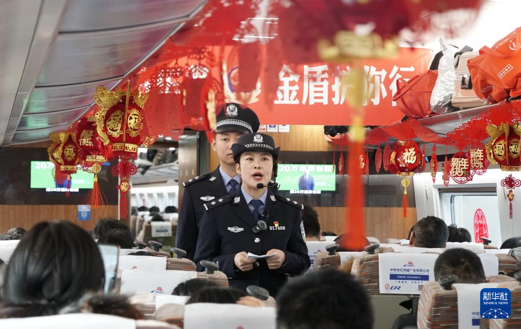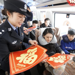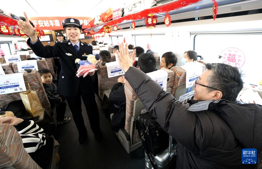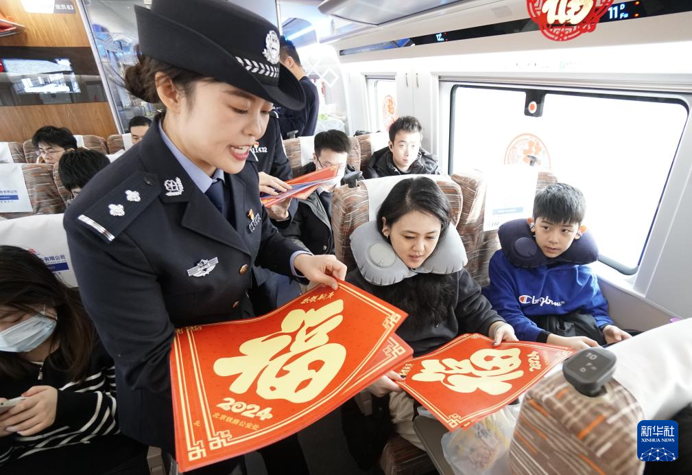 当日,在北京西站开往西安北站的G55次高铁列车上,北京铁路公安处的铁路民警与旅客一起举办了一场联欢活动。铁路民警和旅客一起贴窗花、挂福字,将车厢内点缀得充满年味儿。此外,铁路民警还为旅客讲解安全出行、反诈防扒知识。