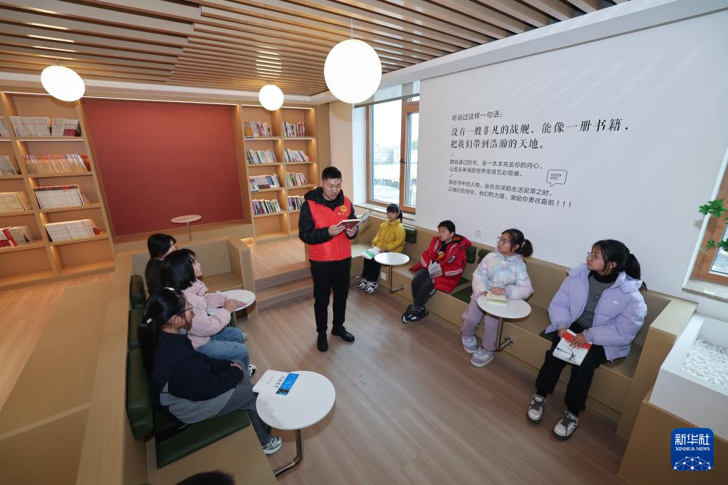 2月2日,在东林镇东华村党群服务中心开办的寒假托管班上,党员志愿者带着孩子们上阅读课。