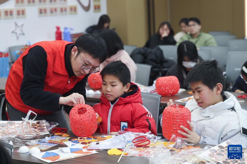 2月2日,在东林镇东华村党群服务中心开办的寒假托管班上,党员志愿者指导孩子们制作新年灯笼。