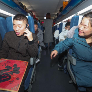 2月1日,龙春香(右一)、闵德水(右二)在G4835次列车上展示福字。