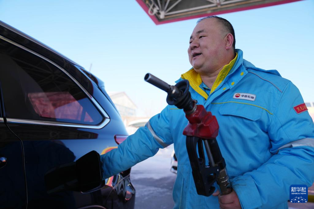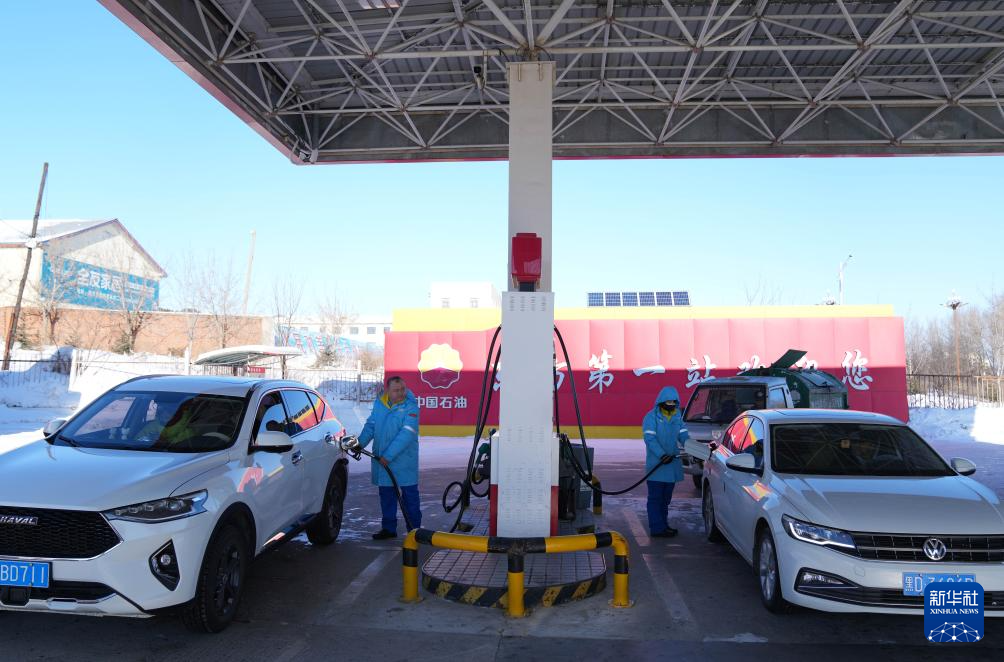 2月2日,中石油黑龙江抚远东方第一加油站站长李秉峰(左)和同事给车辆加油。