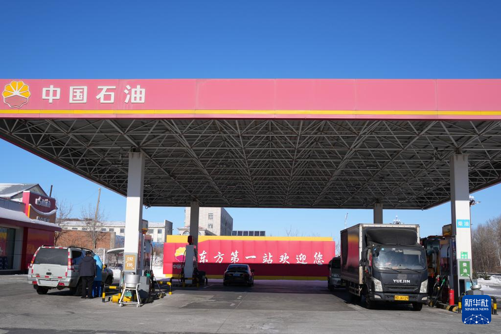 2月2日,车辆在中石油黑龙江抚远东方第一加油站加油(无人机照片)。
