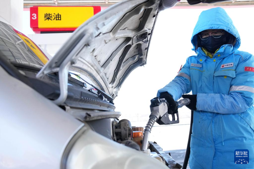2月2日,中石油黑龙江抚远东方第一加油站加油员肖洋灵在给车辆加油。