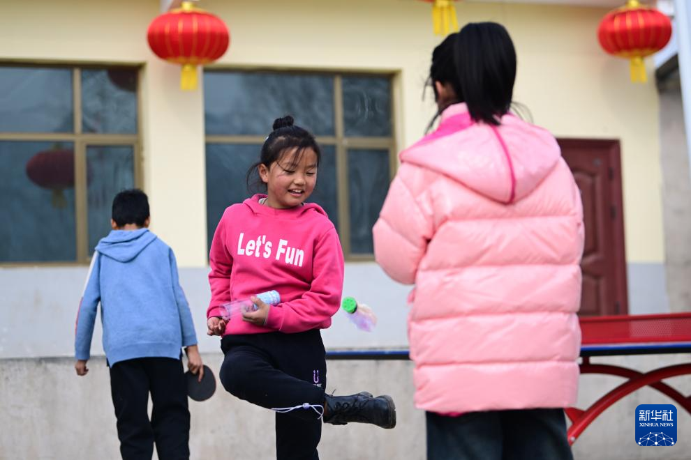 2月3日,小朋友在海东市民和回族土族自治县中川乡金田村安置点的“儿童之家”踢毽子。
