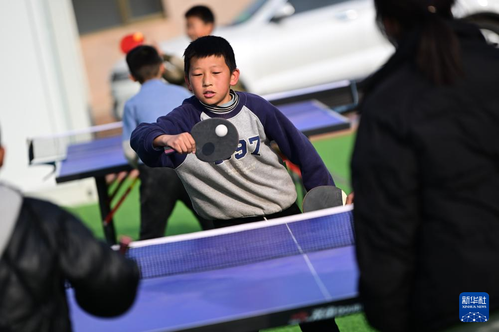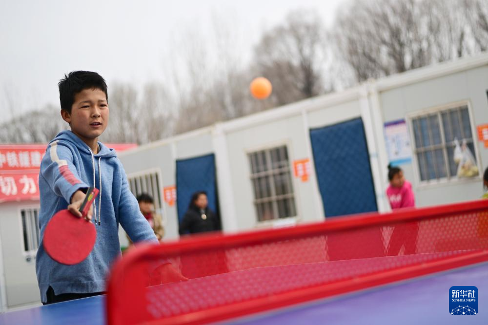 2月3日,小朋友在海东市民和回族土族自治县中川乡金田村安置点的“儿童之家”打乒乓球。
