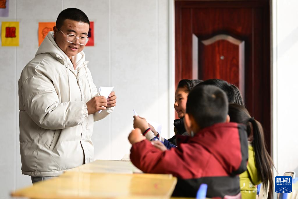 2月3日,在海东市民和回族土族自治县中川乡金田村安置点的“儿童之家”,大学生汪克辉(左)教小朋友们折纸。