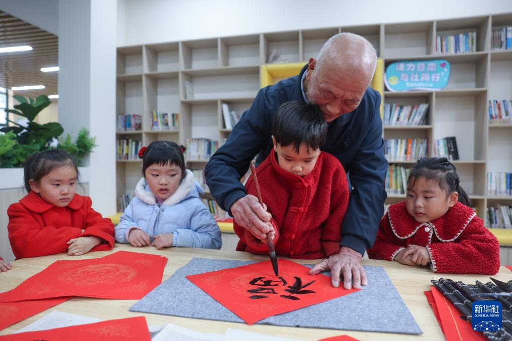 2月3日,一位老人在“老幼共融,双龄共养”迎新春主题活动上指导孩子们写福字。