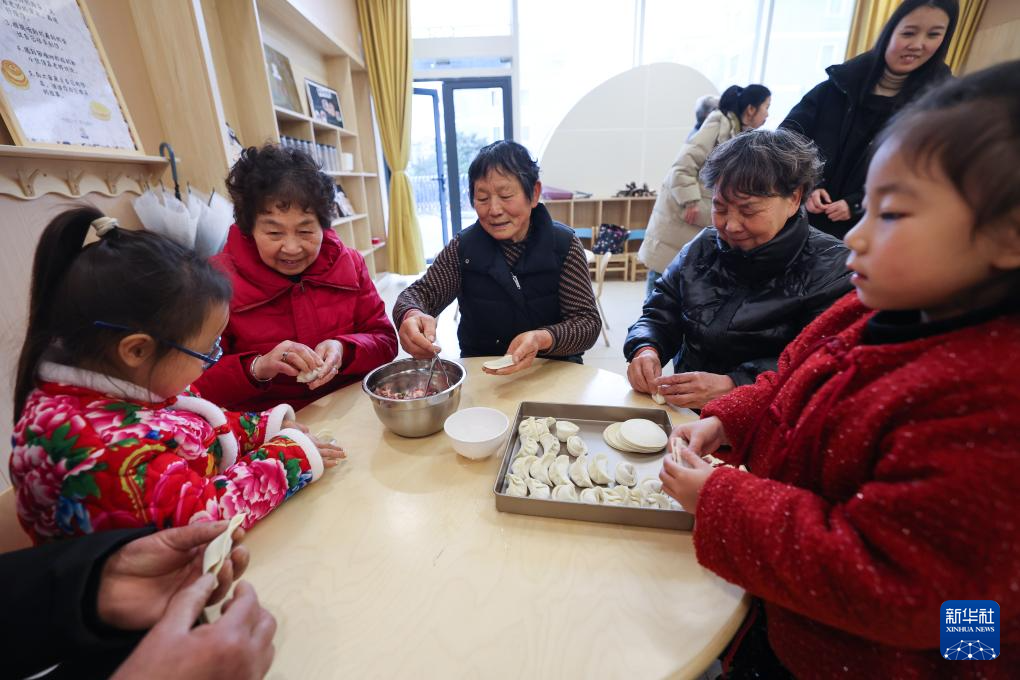 2月3日,暨南街道中心学校下属三江幼儿园的孩子们与三江新村的老人们一起包饺子。