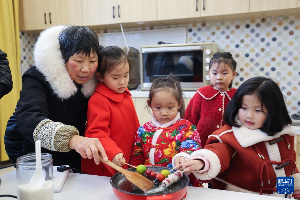 2月3日,老人们与暨南街道中心学校下属三江幼儿园的孩子们一起做糖葫芦。