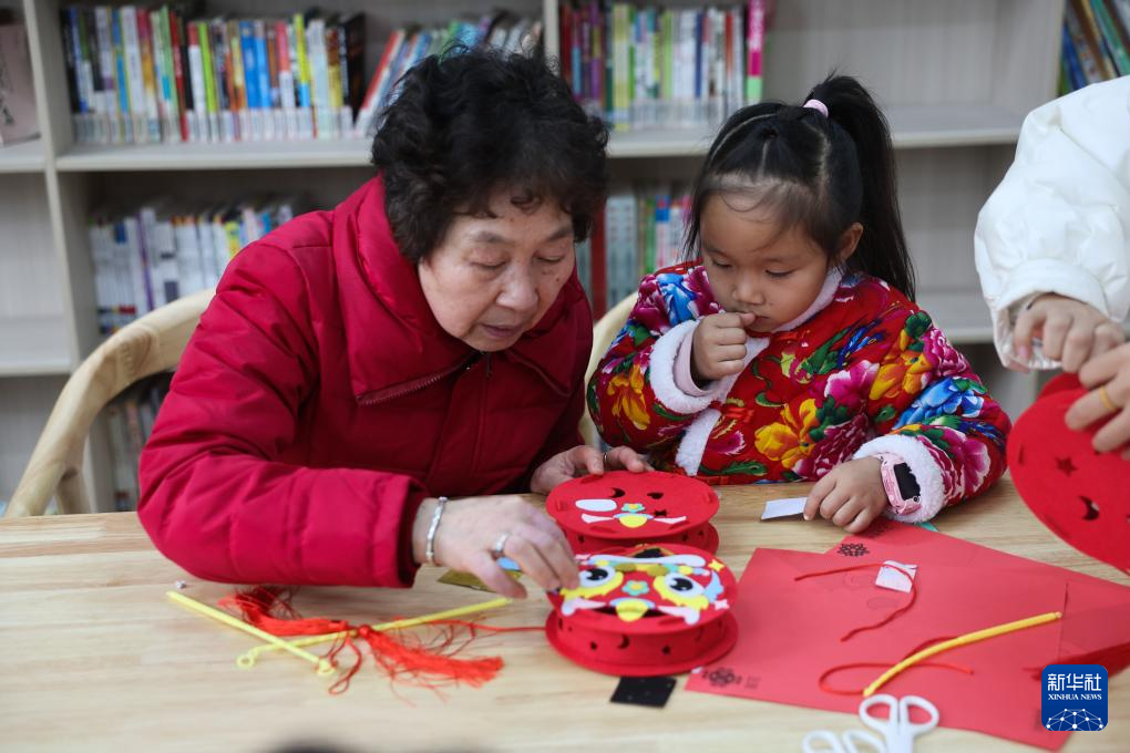 2月3日,暨南街道中心学校下属三江幼儿园的孩子与三江新村的老人一起制作新春花灯。