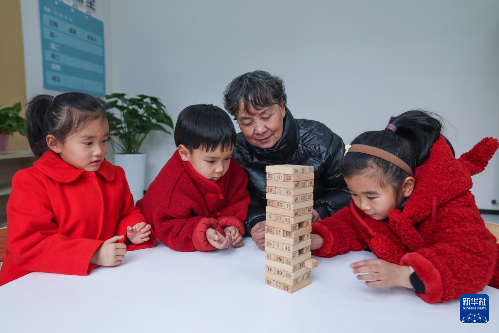 2月3日,在暨南街道一老一小“老幼共融,双龄共养”迎新春主题活动中,老人与孩子们一起玩桌游。