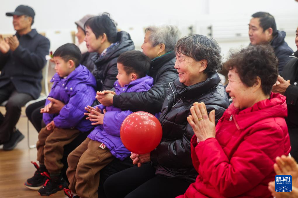 2月3日,在暨南街道一老一小“老幼共融,双龄共养”迎新春主题活动中,老人在观看孩子们的表演。