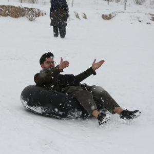 2月3日,人们在阿富汗首都喀布尔雪中休闲。