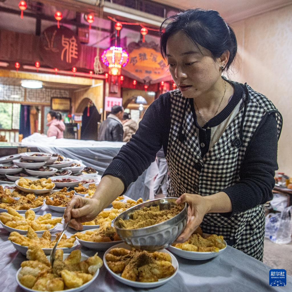 2月3日,重庆江津区中山古镇的一户商家为“千米长宴”准备菜品。