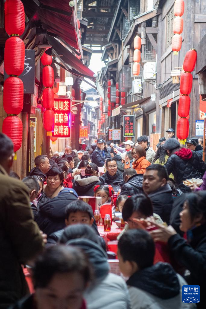 2月3日,游客在重庆江津区中山古镇老街上体验“千米长宴”。