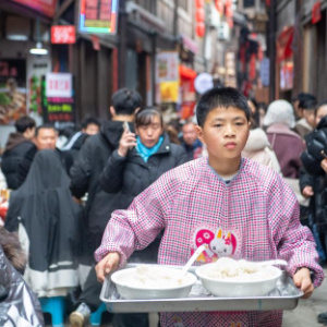 2月3日,重庆江津区中山古镇的居民给体验“千米长宴”的游客端上米饭。