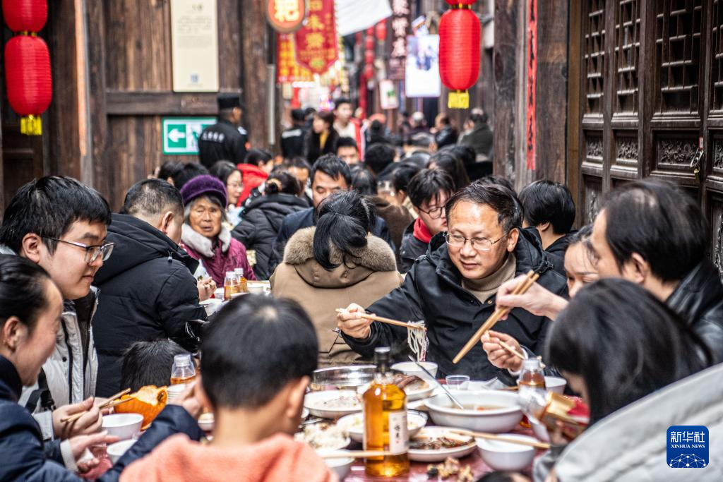当日,第十九届中山古镇“千米长宴”非遗民俗文化季在重庆江津区中山古镇老街热闹开席,来自全国各地的游客齐聚古镇,在这里品年味、忆乡愁。