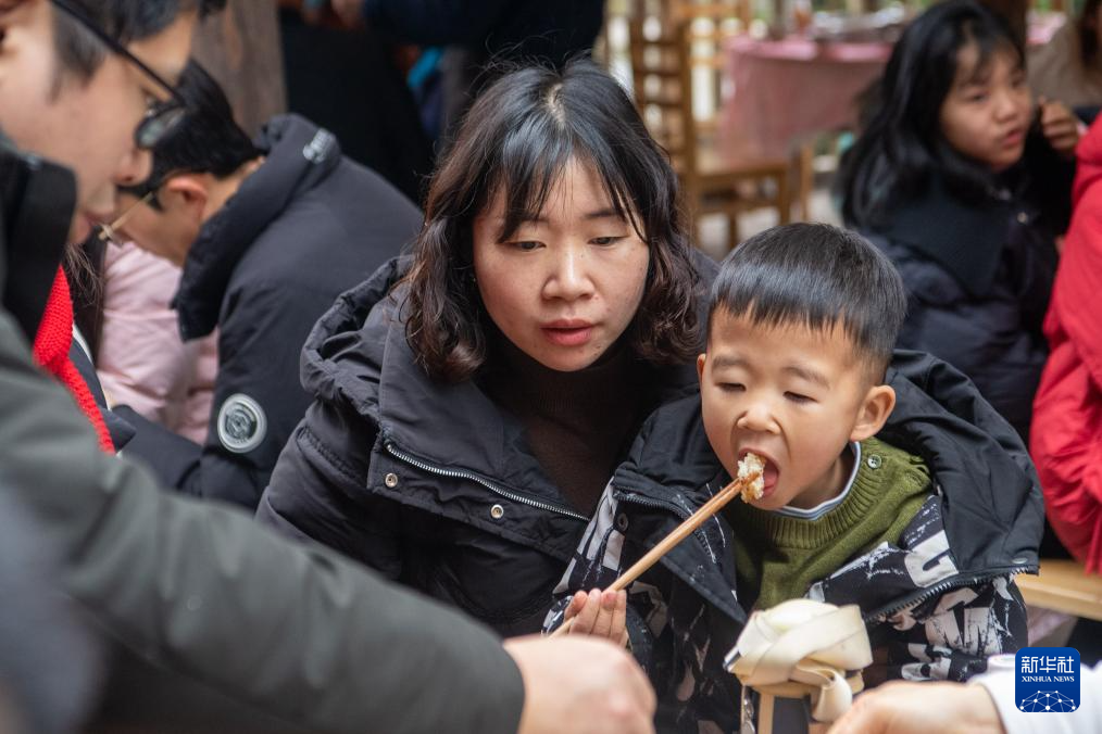 2月3日,小朋友在重庆江津区中山古镇老街的“千米长宴”上品尝美食。