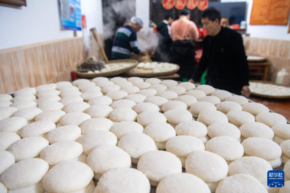 2月3日,重庆江津区中山古镇的一户商家为“千米长宴”制作糍粑。
