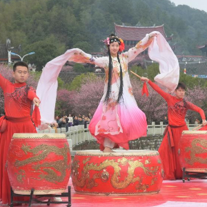 2月3日在福州林阳寺拍摄的梅花文化节上的鼓乐表演。