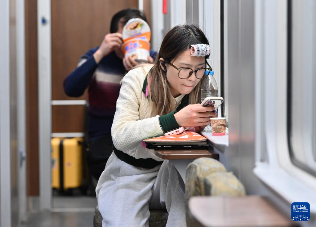 2月3日,在D59次列车上,一名头戴卷发器的女孩在看手机。
