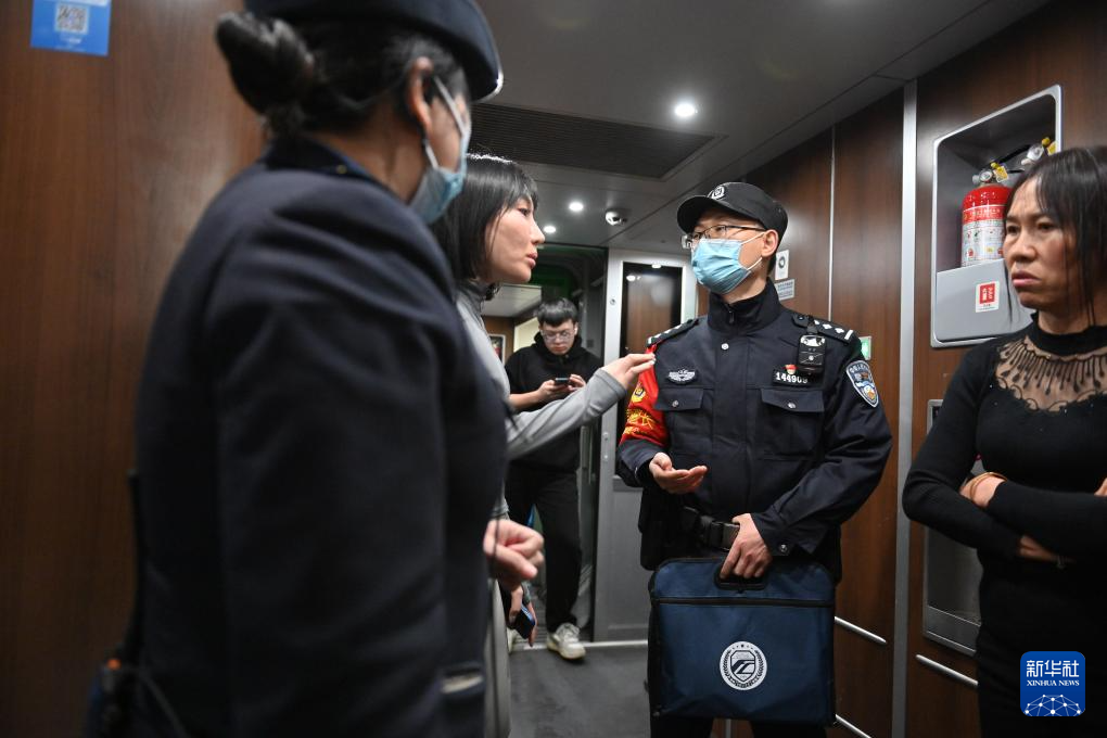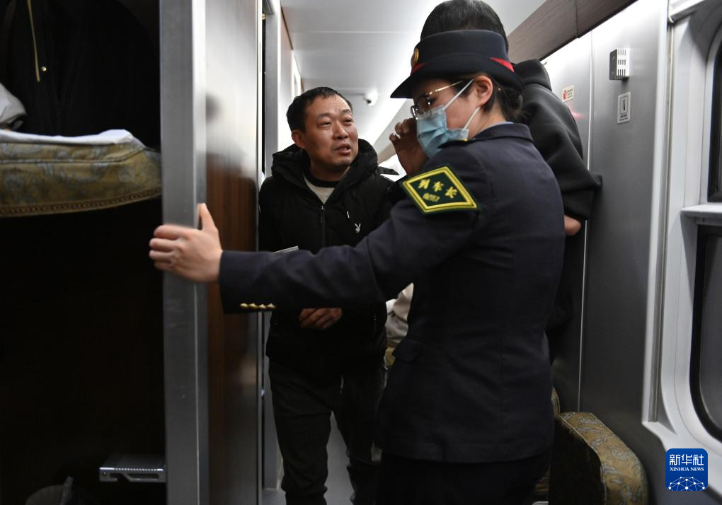 2月3日,在D59次列车上,列车长李俐含(前)刚刚调解完旅客之间的小摩擦,一名旅客上前表示赞赏。