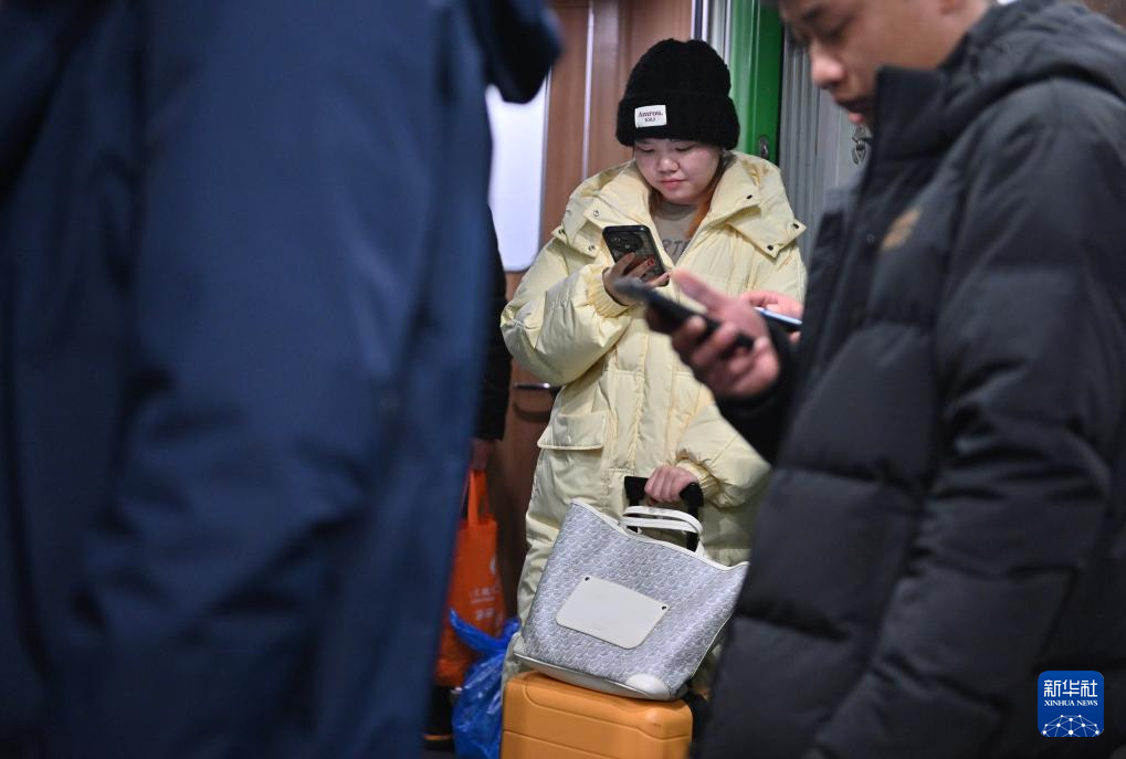 2月3日,在D59次列车上,旅客在车厢连接处看手机。
