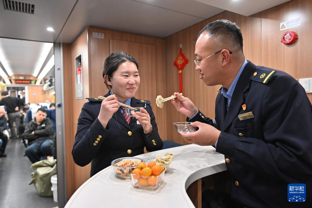 2月3日,在D59次列车上,列车员郭晓雯(左)和车辆乘务长贾连山吃饺子。这是这对新婚夫妻第一次在列车上过小年。